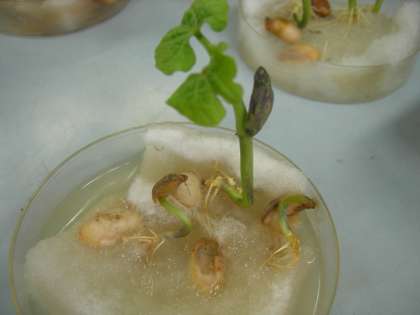 土に植えると,種子がどちらを向いていても根を伸ばせますが,綿の上では,根が上向きに出ると水を吸い上げられないで腐ることも分かりました。写真は根や茎になる部分が水に浸かるように置いたものです。