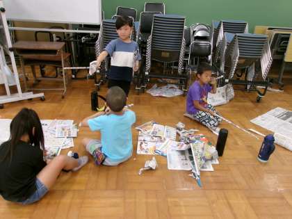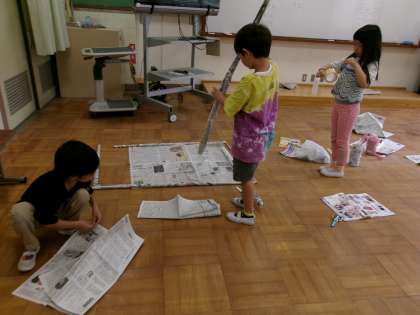 新聞をやぶったり、丸めたり、ねじったりしながら、新聞紙でどんなことができるか試していました。楽しそうでした。