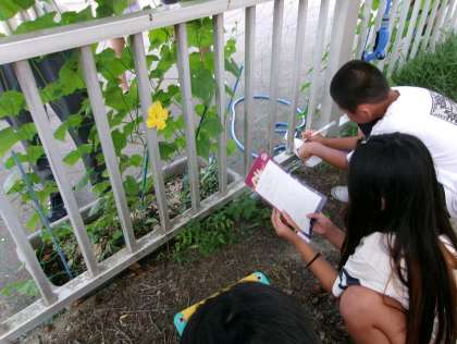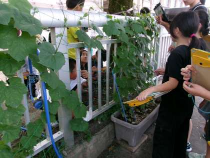 ヘチマの観察をしました。ちょうど花がさいているところを見ることができました。夏休み以降も観察を続けるそうです。暑いですが、元気に育ってほしいです。
