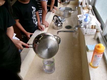 鍋やフライパン、やかんには、何リットル入るのだろう?リットルますをもって家庭科室で調べました。