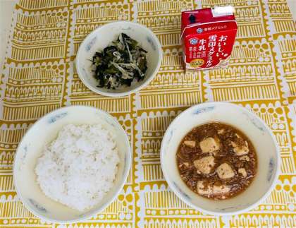 献立は、ごはん・牛乳・マーボどうふ・切干大根のいためナムルでした。