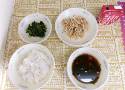 今日の献立は、ごはん・牛乳・こぎつねちらしの具・ほうれん草のおかか煮・赤だしでした。