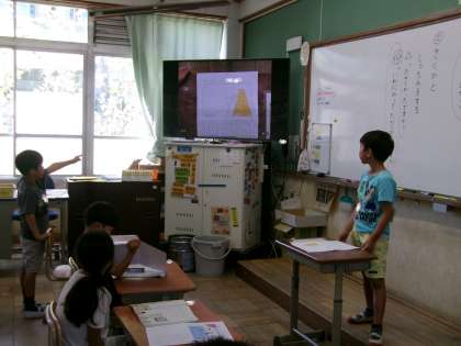 夏休みにあったことを絵日記にして発表していました。質問もし合っていました。