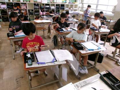 「大」という字を毛筆で書きながら、右はらい左はらいの筆づかいについて学習をしています。