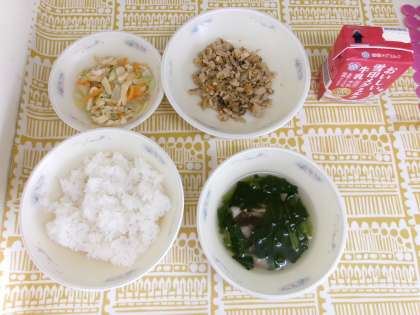 今日の献立は、ごはん・牛乳・とりめしの具・キャベツの煮つけ・すまし汁でした。