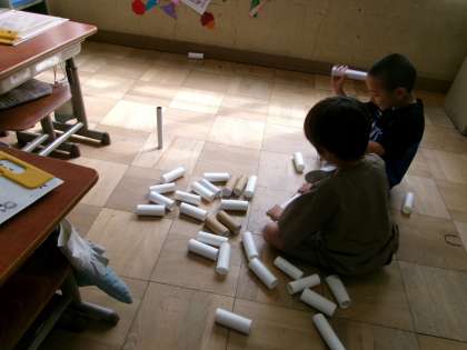 身近にあるものを使って、みんなと楽しみながら、遊びを創り出そうとしていました。材料のご準備ありがとうございました。