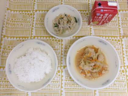 今日の献立は、ごはん・牛乳・鶏ちゃん・もやしの煮びたしでした。