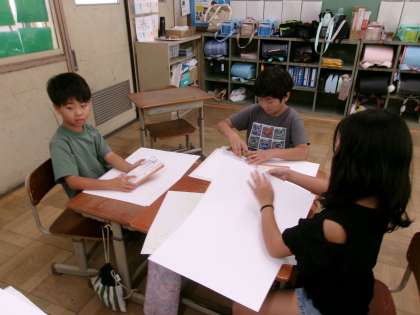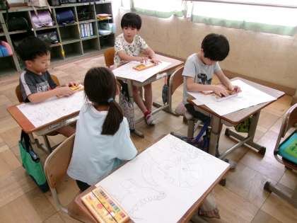 お話の絵の本番に入るようです。白い画用紙を配ってもらって、描き始めるところでした。