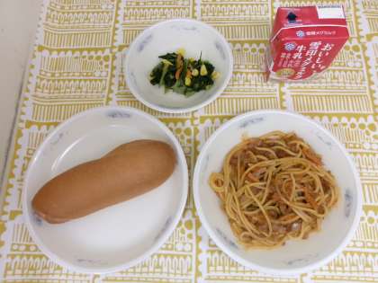 今日の献立は、小型コッペパン・牛乳・スパゲティのミートソース煮・小松菜のソテーでした。