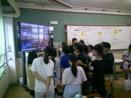 両クラス団体演技の様子を動画で確認しています。各クラス前のめりで見ています。
