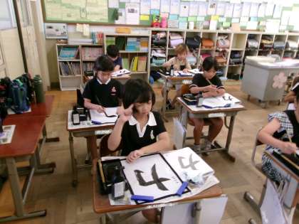毛筆の学習の様子です。「力」という字を書きながら、「おれ」と「はね」の筆づかいを学習していました。