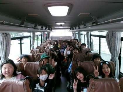バスに乗って、山の家に向かいます。みんな楽しそうです。