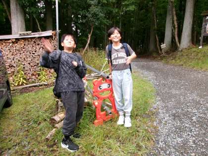 タヌキの看板を見つけて、ぽんぽこポーズをする子もいました。楽しそうです。