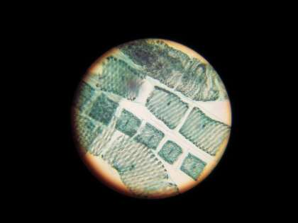 対物レンズを4倍,10倍,40倍と替えながらグラフの枡目,蝶の鱗粉,ジャガイモのでんぷん,アオミドロ,ミドリムシなどを観察しました。写真は280倍で見たでんぷんとアオミドロです。