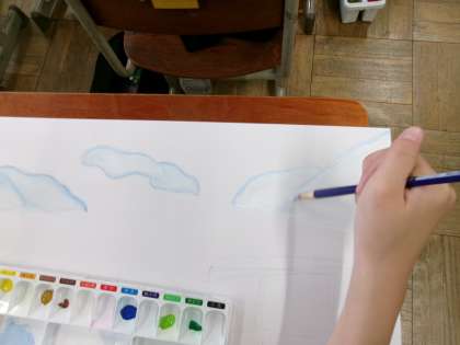 彩色に取り組んでいました。とてもきれいな色づかいで空や雲をぬっている子もいました。