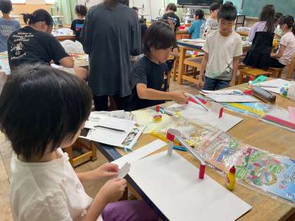 ビー玉がコロコロ転がる仕組みを工夫して作っています。出来上がるのが楽しみです。