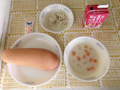 今日の給食は、コッペパン(国産小麦100%)・牛乳・ツナサンド(具)・マヨネーズ・白いんげん豆のチャウダーでした。