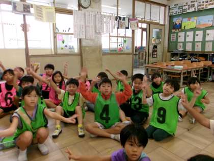 教室で動画を見ながら、振り付けを覚えていました。競技の練習がうまくいっているようです。入場もうまくいきますように。