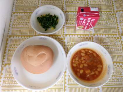 今日の献立は、バターうずまきパン・牛乳・鶏肉と大豆のトマト煮・ほうれん草のソテーでした。