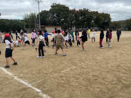 中間休み,1年生と4年生が一緒にしっぽ取りゲームをして遊びました。お兄さん,お姉さんとして仲良く楽しく遊んでいました。