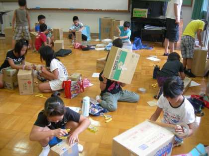 ダンボール箱に開ける穴の形や大きさ,数を工夫して空気砲を作りました。両手で箱の腹を叩くと風が起こります。煙発生器で煙を満たすと,ドーナツ型の煙の輪が10メートルぐらい飛びました。星型の穴でも丸い煙が出ます。ろうそくの火を目がけて発射すると消えました。