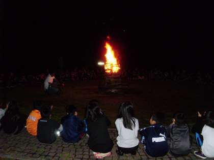 山の家最後の夜はキャンプフャイヤーで楽しみました。火の神から聖なる火をもらい,火の子が着火しました。ゲームをしたりフォークダンスを踊ったりして盛り上がりました。