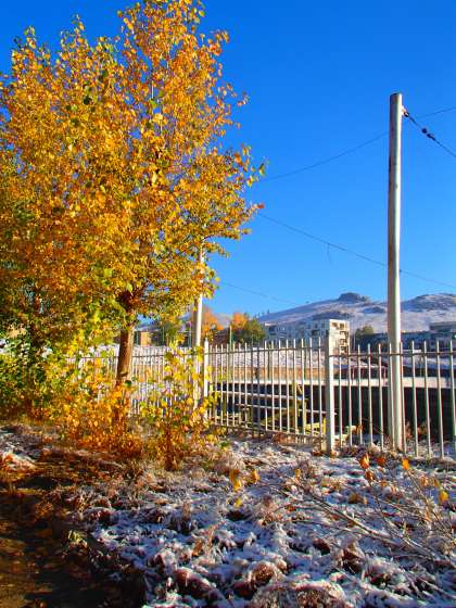 今朝起きると,今年の初雪が積もっていました。寒くて嫌だけど,雪景色がきれいでまたこの街(エルデネト)が好きになりました。日中は太陽がまぶしいくらいに照り,子どもたちの元気な声がそこらじゅうで聞こえています。これから真冬にかけどんどん寒くなり,マイナス30度まで下がるそうです。