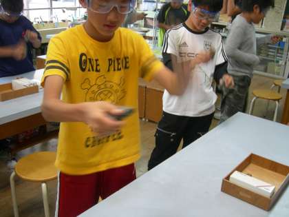 鋼をチャートの角にこするようにぶつけると火花が出ます。この火花をもぐさに点けると火が起こるのですが,今日は火花を飛ばす体験をしました。何度もやるうちにコツがつかめてきました。