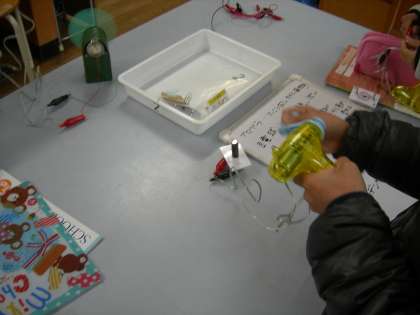 電気は,光や音,熱,回転などに換えて利用しています。この単元の学習を始めるにあたり,調べたい問題づくりをすべく,手回し発電機でつくった電気を光や音,熱,回転などに換えてみて感じたことを出し合いました。