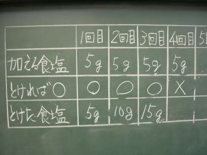 50mLの水に,食塩は限りなく溶けるのか調べました。食塩5gを加えてよく振り,溶けたらまた食塩5gを加えるという方法で記録していくと,3回目の15gは溶けたものの20gは溶け残りが出ました。