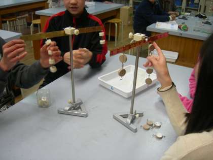 実験用てこを使って,左右の腕の釣り合いや傾きについて,どんな決まりがあるのか探りました。しばらく自由に左右の腕に錘をぶら下げているうちに,錘の重さと目盛りの数の積に着目すればよいことに気付いてきました。決まりが分かった後,上皿天秤や天秤は,腕に支えられた2つの皿の釣り合いから重さが分かる仕組みになっていることを学習しました。