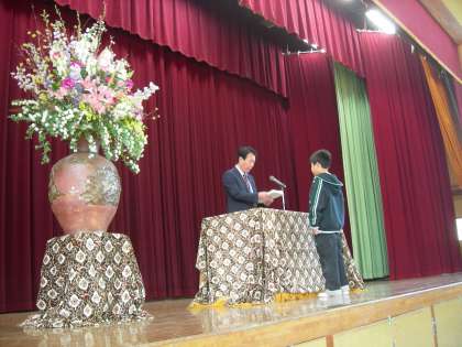 校長先生から5年生の代表に,平成24年度の修了証を渡す式がありました。「心も体も健康で,すすんで学習する子」という学校目標,「深く考える子」「なかよく認め合う子」「元気でがんばる子」の目指す子ども像に対して,自分はどうであったか振り返って,できるようになったことは自信に,できなかったことは来年度にできるようにしましょうと話されました。