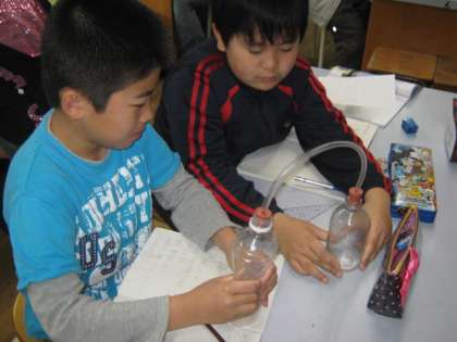 雲量の写真のカードをもって空全体を見上げ,9割ぐらいが雲でしたので今の天気は「くもり」となりました。また,雲のようにペッロボトルの中が白くなる実験もしました。