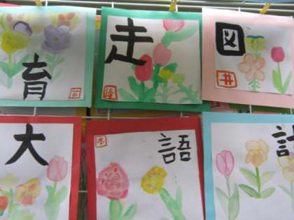 5年生になっての目標などを漢字一文字で表し,春の花の絵を絵の具で描きました。漢字に込めた気持ちを大切にしていきたいです。春の花は,水の量を多めにして,絵の具がにじむように工夫をしました。たくさんの素敵な作品が完成しました。