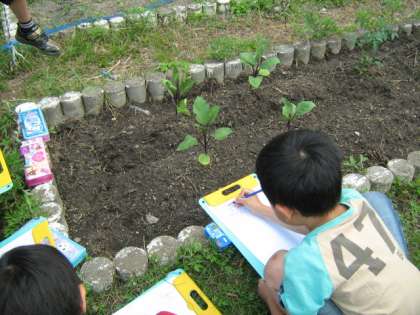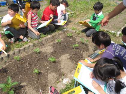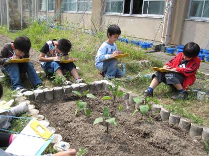 中庭の畑に野菜の苗を植えています。今日は,その苗の観察をしました。ミニトマト・ナス・ピーマン・インゲン・オクラ。それぞれ葉の形や,色,高さが違っていることをよく観察できました。