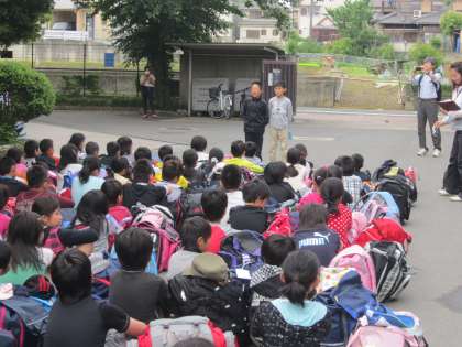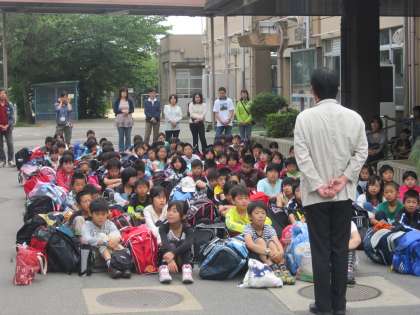 4年生児童全員,三重県,みさきの家に向けて出発しました。元気に出発式を行いました。友達と一緒に活動する中で京都では味わえない自然体験をし,多くのことを学んでほしいと思います。