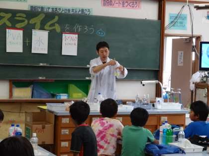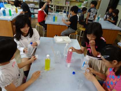 本年度第1回目のサイエンススクールを行いました。今回は子どもたちの大好きなスライムづくりです。先生からの説明を聞いた後,早速スライムづくりにとりかかりました。どんな色にするかかたさをどうするか,子どもたちは自分なりに工夫をして作っていました。最後に先生からすごいスライムのプレゼントがありました。どんなスライムか?写真を見て分かりますか?