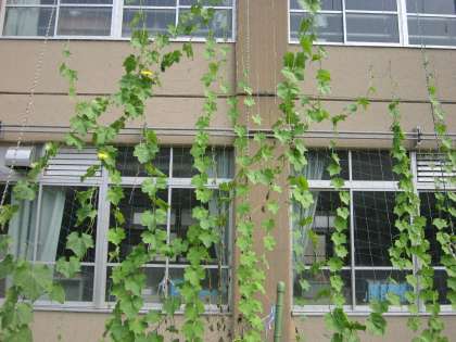 立秋とは名ばかりの今年一番の暑さがここ1週間ほど続くようです。中庭の緑のカーテンもどんどん伸びています。西洋アサガオは,ツルが3階から屋上に達するぐらいです。ヘチマも黄色の花を咲かせています。夏休み明けまでにさらにどれだけ葉が茂って窓を覆っていくか楽しみです。