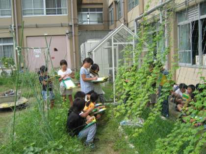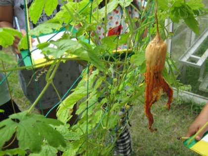 ツルレイシの観察をしました。夏休みの間に実をつけたツルレイシに変化がありました。実の色が緑色から黄色に変化していました。落ちている種も見つけました。