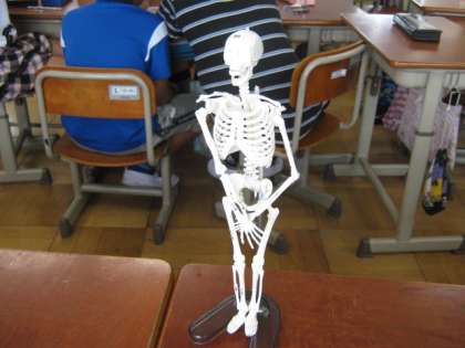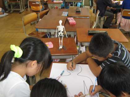 人の骨と筋肉は,体の中のどこにあるのかを調べました。人体骨格模型のミニチュア版をよ〜く観て,骨の様子をグループで協力して画用紙に書きました。小さな骨がたくさんあって,とっても大変でしたが,人の体にはたくさんの骨があることが分かりました。