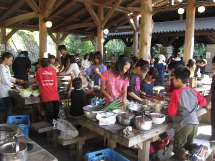 すき焼き風煮を作りました。まずは班で協力して,野菜や肉を切りました。