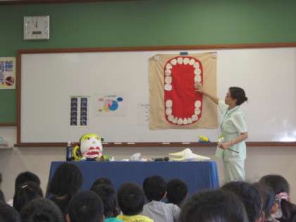 歯科衛生士さんが,歯みがきの仕方を教えに来てくださいました。歯は,やさしく丁寧にみがくこと,食べたらみがくことを教えてもらいました。かわいい人形を使って,楽しく学習ができました。
