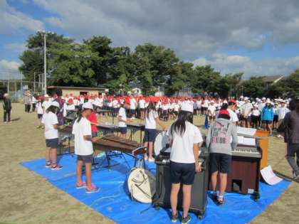 日野小学校の運動会では,音楽部の高学年のみんなが開会式や閉会式でも大活躍をしてくれます。運動会に向けて,開会式での校歌や優勝杯返還のファンファーレ,得点発表でのドラムマーチなどを色々な楽器を使い生演奏をしてくれます。今日の全校練習でも,青空のもと素敵な演奏をしてくれました。運動会の本番でも,素敵な演奏を響かせてほしいと思います。
