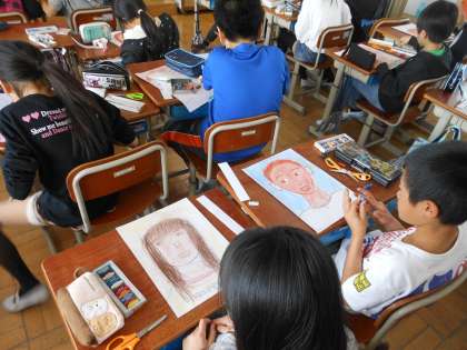 「似てる?」「なんか変になった・・」と近くの人とおしゃべりをしながら,自画像を仕上げました。教室うしろの掲示板に掲示しようと思っています。5年生のおわり,6年生になる頃には,この顔とはきっとまたちがう表情を見せてくれるのではないかなと思っています。