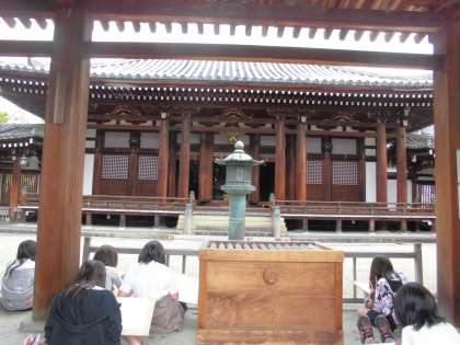 28日(月)の1・2・3時間目に日野誕生院へ行ってきました。ご住職さんにご挨拶をし,図工でお寺の建物の写生をさせていただきました。斜めから見て奥行きを出して書くよう工夫し,細かいところまで時間をかけて書いていました。絵の具での色付けも丁寧にしていきたいです。