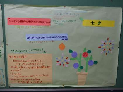 日本語教室では,先月から壁新聞作りに挑戦しています。出身国の食文化や生活文化などを月や季節に合わせて紹介しています。もちろん二ヶ国語です。どの子も母国の紹介を書く時は生き生きとしています。