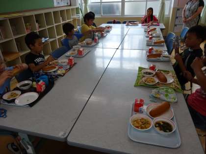 本日,7月のJランチを行いました。Jランチの日は,配膳準備も日本語教室で行います。ピカピカに光るステンレスワゴンに給食を載せて教室まで運びます。食べた後もみんなで協力して片付けます。一つ一つの事柄が日本文化への理解につながっていきます。