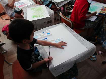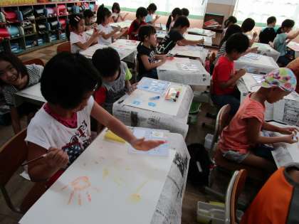 最初は慎重に,ゆっくりと画用紙に手を押しつけていた子も,慣れてくると「ドンドン」と音を立てて,楽しんで色をつけていました。