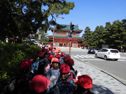 昼食時間は,社会科の学習でも学んだ文化的な施設や寺・神社が多く集まるところ周辺で過ごしました。動物園・美術館・平安神宮を実際に目にすることができました。大きな朱色の鳥居にも驚きでした。