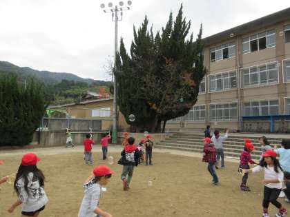 あおぞら学級のみんなから招待を受けて,クラスごとにシャボン玉大会に参加しました。
